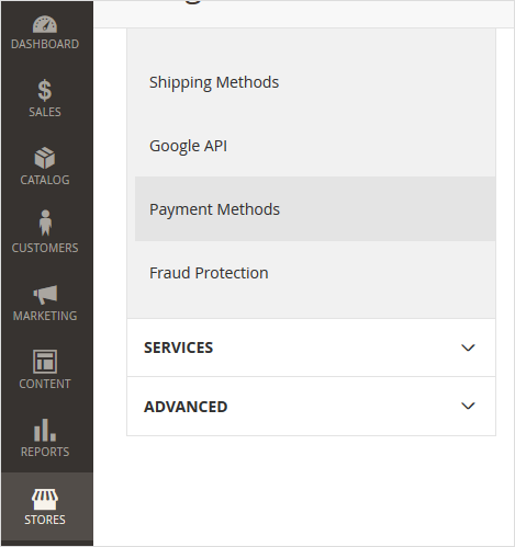 - From the dropdown menu on the page, select Sales> Payment Methods Please refer to the image below.