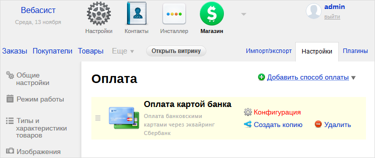 With the installed plugin for Webasyst, your customers will be able to pay with you through the payment page of «Sberbank». The payment plugin requires the Shop-Script extension previously installed on Webasyst to create an online store. You can download Webasyst with the preinstalled Shop-Script extension here (external ink).
