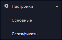 - В навигационной панели личного кабинета слева выберите Настройки > Сертификаты (см. изображение ниже).