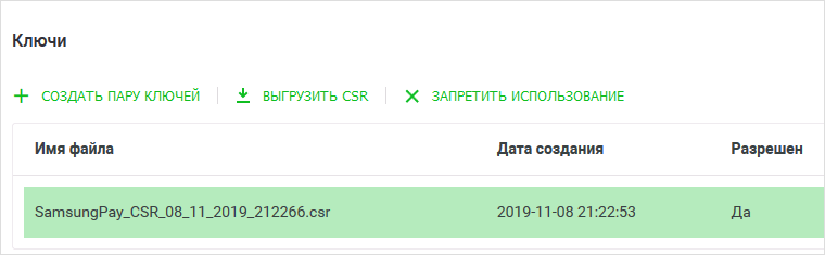 - Чтобы выгрузить запрос подписи сертификта (CSR), на вкладке Samsung Pay раздела Настройки > Сертификаты личного кабинета отметье нужный сертификат щелчком мыши (см. изображение ниже).