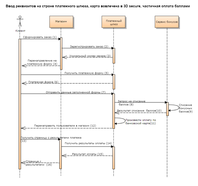 8 | Платёжный шлюз отправляет сервису бонусов запрос на списание бонусных баллов. |