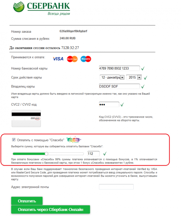 3. Задайте параметры банковской карты, участвующей в программе лояльности. После ввода номера карты в нижней части платёжной страницы отобразится блок для ввода количества бонусных баллов: