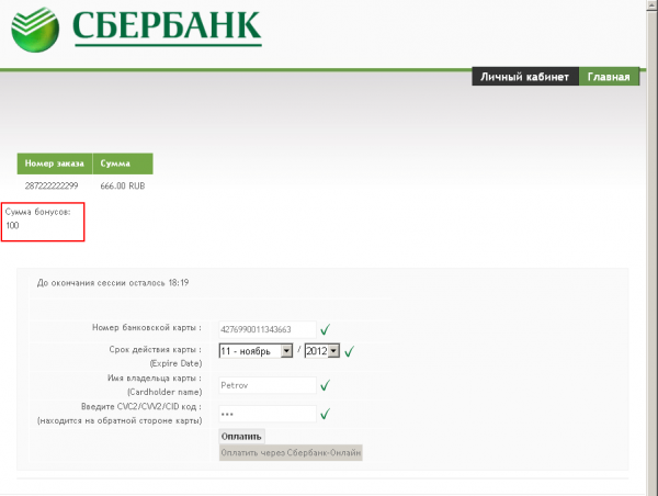 Примечание: На платёжной странице рядом с номером заказа и суммой будет указана сумма заказа в бонусах.